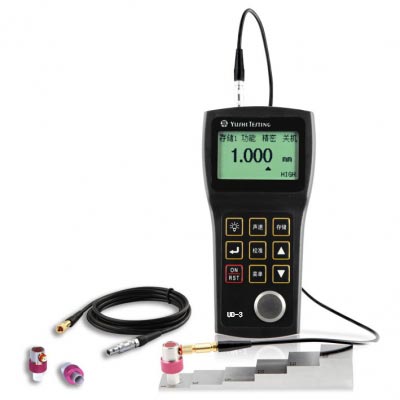 單晶延遲線(xiàn)探頭的手持式精密超聲波測(cè)厚儀UD-3,采用單晶延遲探頭,利用多次回波提高精度,使分辨率可達(dá)0.001mm,測(cè)量下限達(dá)0.30mm 。UD-3具有普通和精密兩種工作模式。普通模式采用界面波-回波法,測(cè)量范圍是 1.5mm~20mm ;精密模式采用回波-回波法,測(cè)量范圍是 0.30mm~10mm。